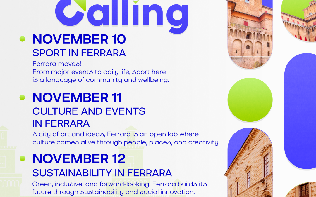 Ferrara Calling presenta una nuova serie di webinar gratuiti e in inglese dedicati ai temi che raccontano l’evoluzione della città: sport, cultura e sostenibilità. Tre appuntamenti per approfondire come Ferrara continui a crescere, innovare e costruire comunità attraverso le persone e i progetti che la rendono viva ogni giorno.